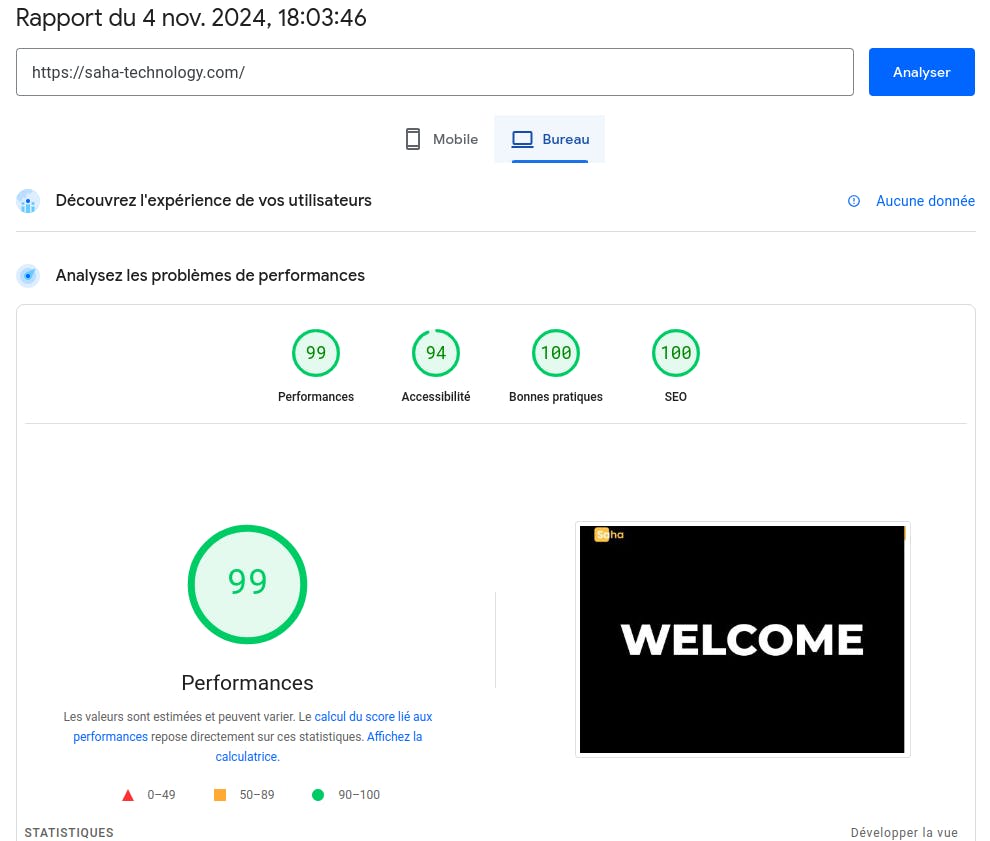 Chez SAHA Technology, nous savons que le score Google PageSpeed de votre site Web est crucial. Un score faible peut avoir un impact sur votre classement et l'expérience utilisateur. Nous proposons un audit gratuit de votre site Web pour vous aider à améliorer les performances et l'engagement. Nous vous invitons à parcourir nos projets si vous hésitez encore.